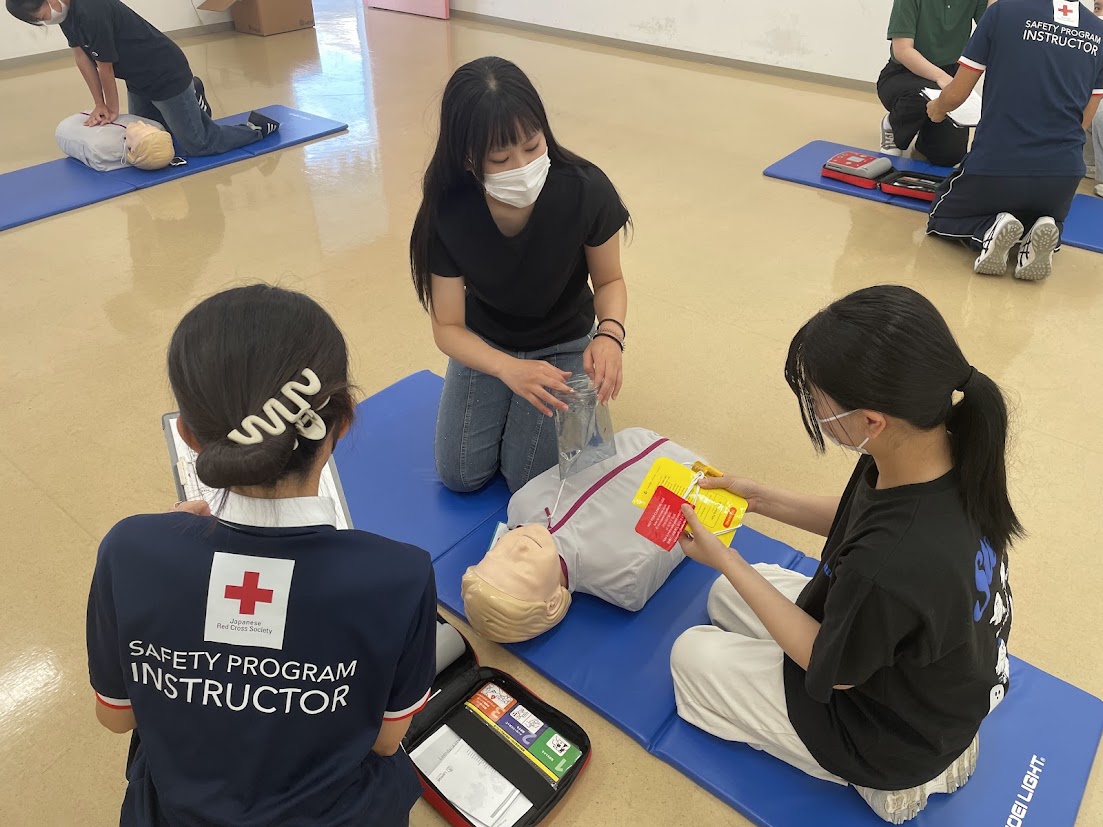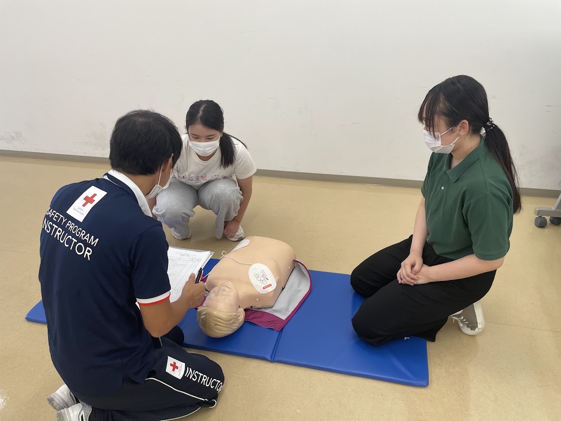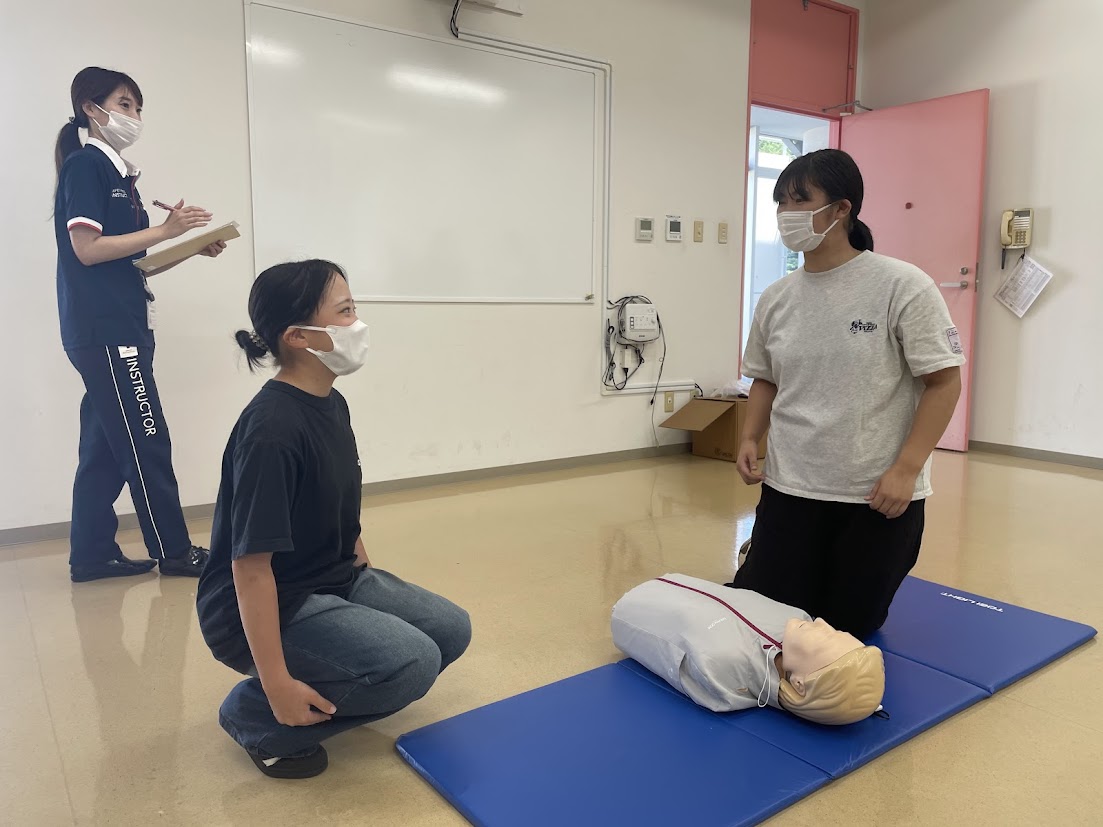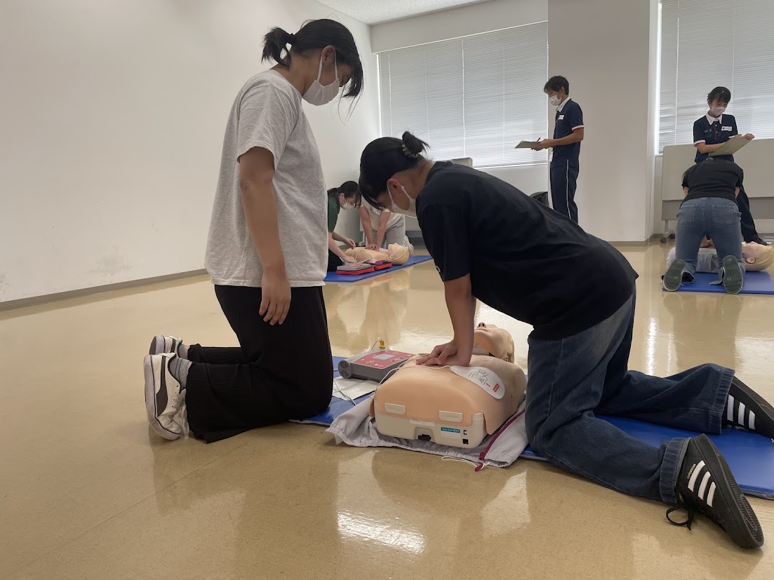 受講者は、事前に講義動画を視聴し、小テストを満点で終えたうえで、実技テストに臨みます。特にAEDを使った一次救命処置の場では、救急法指導員の資格を持った本学の教職員が、厳しく、丁寧に指導しています。