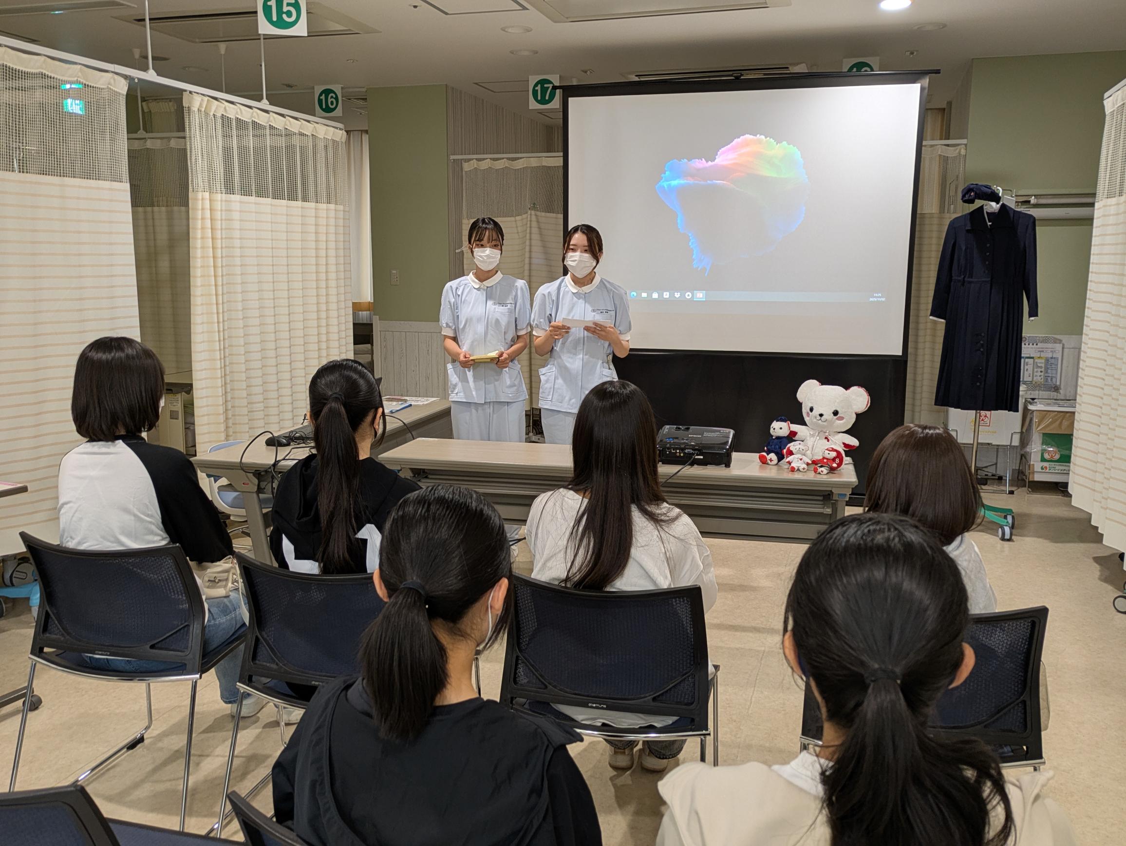 同病院では本学の卒業生も活躍しており、当日は同じコーナー対応だった先輩たちからもアドバイスをもらい、春の入職に向けて緊張もありながら期待を膨らませていました。