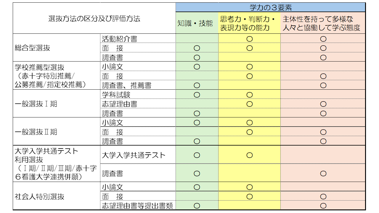 本学では、総合型選抜、学校推薦型選抜(赤十字特別推薦/公募推薦/指定校推薦)、一般選抜Ⅰ期、一般選抜Ⅱ期、大学入学共通テスト利用選抜(Ⅰ期/Ⅱ期/Ⅲ期/赤十字6看護大学連携併願)、社会人特別選抜の6つの方法で入学者の選抜を行います。